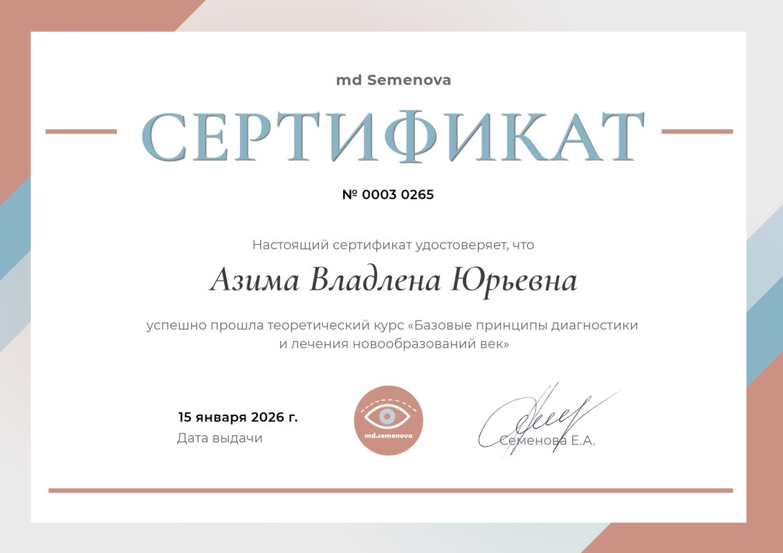 Образование: Окончила Рязанский государственный медицинский университет им. академика Павлова в 2006 году с присуждением квалификации врач по специальности «Лечебное дело». Имеет сертификат сроком по 27.04.2027 г. по специальности «офтальмология».