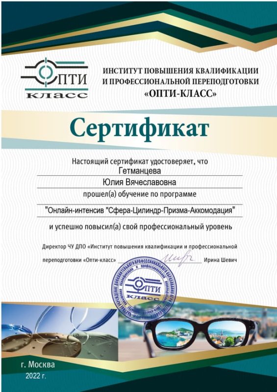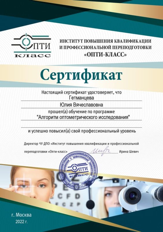| 2022 год | курс усовершенствования по оптометрии в учебном центре Опти-класс. |