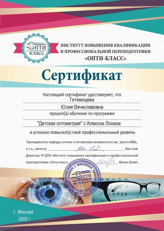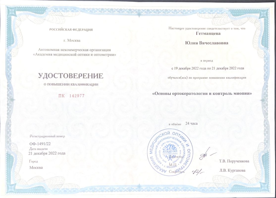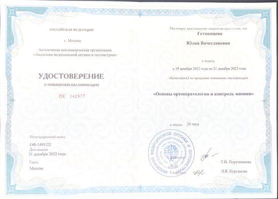 | 2022 год | цикл повышения квалификации «Основы ортокератологии и контроль миопии» на базе учебного центра «Академия медицинской оптики и оптометрии» |