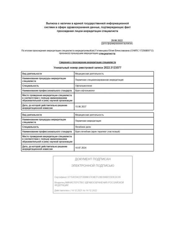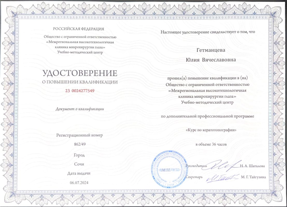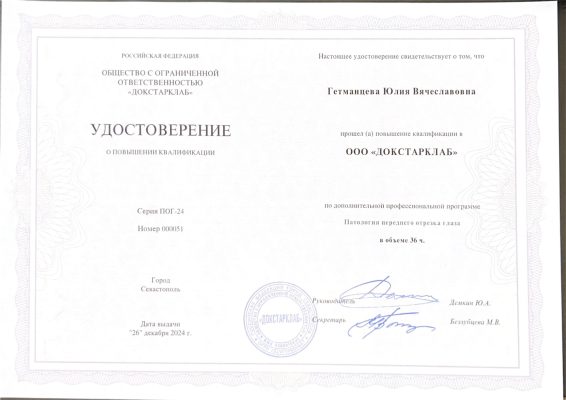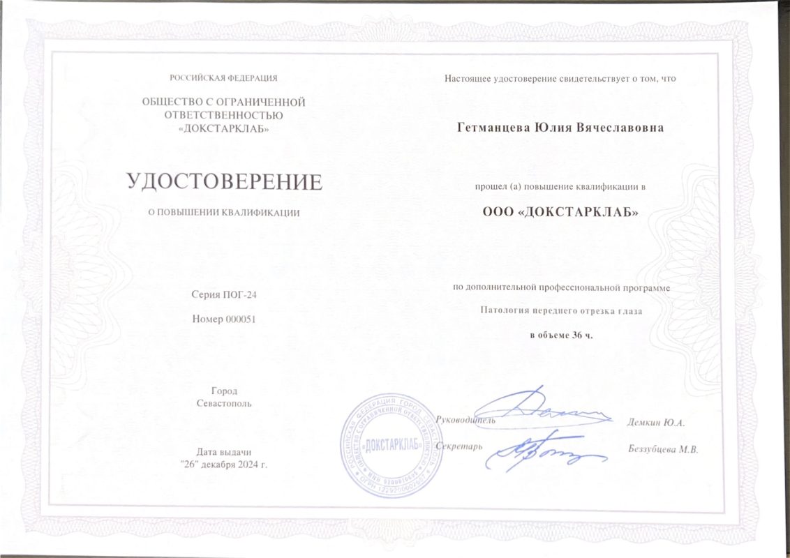 Имеет сертификат сроком по 15.06.2027 г. по специальности «Офтальмология».