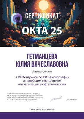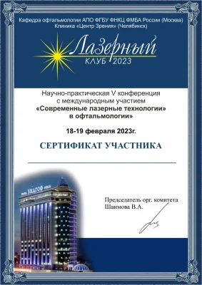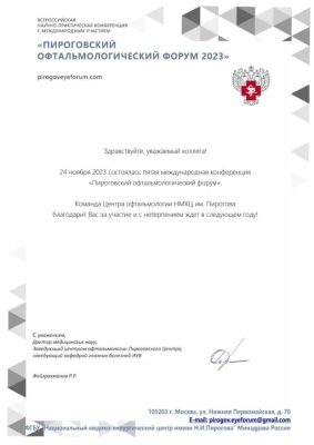 | 2024 год | участник научной конференции с международным участием «Современные технологии лечения витреоретинальной патологии» |