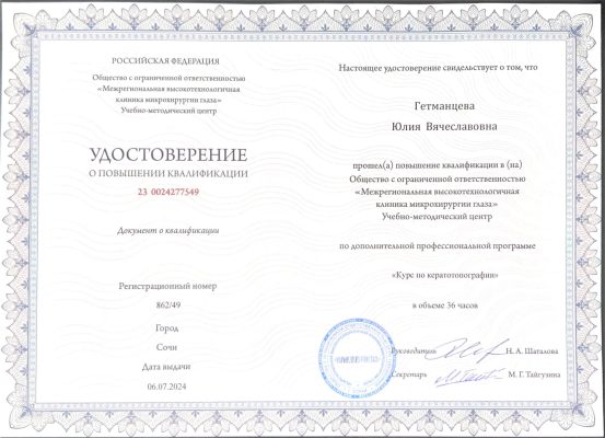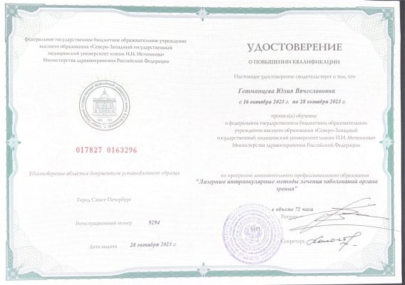 | 2023 год | цикл повышения квалификации «Лазерные интраокулярные методы лечения» на базе МНТК «Микрохирургия глаза» им С.Н. Федорова (Санкт-Петербург) |