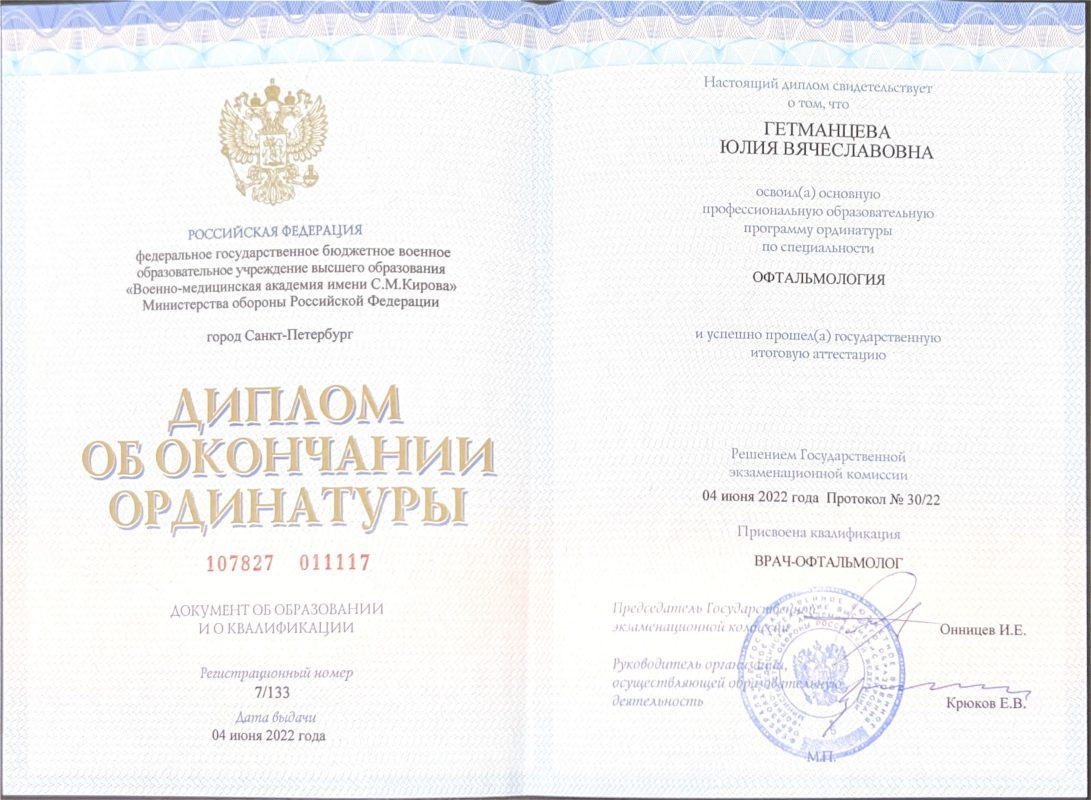 - 2022г окончила ординатуру по специализации «офтальмология» на базе Военно-медицинской академии им. С.М. Кирова.