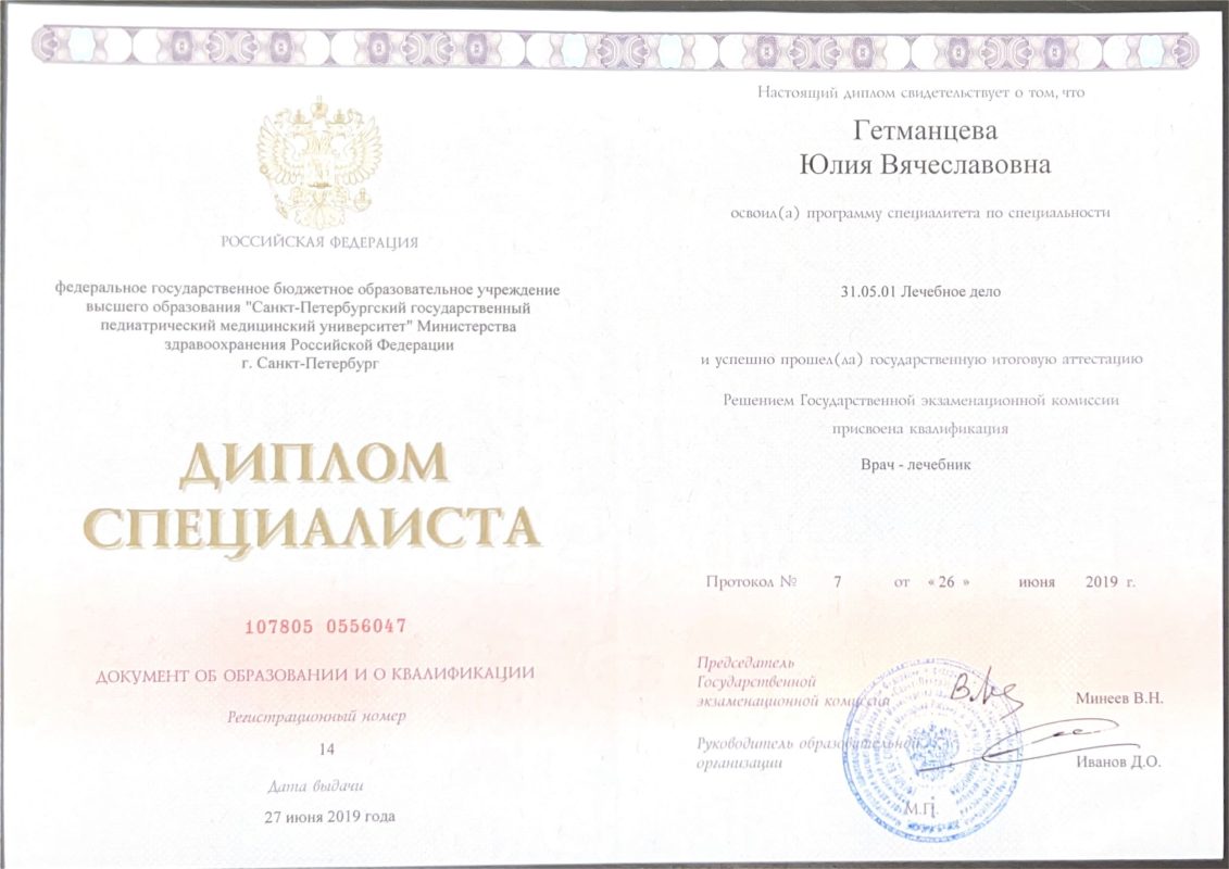 - 2019г — окончила Санкт-Петербургский государственный педиатрический медицинский университет по специальности: Лечебное дело