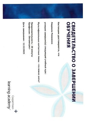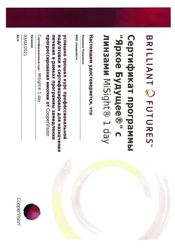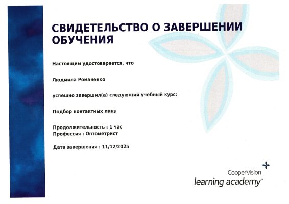Имеет сертификат сроком по 23.07.2029 по специальности медицинская оптика, а также сертификат об обучении на курсе «профессиональная коллегия по развитию коррекции астигматизма контактными линзами».