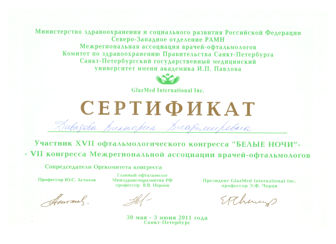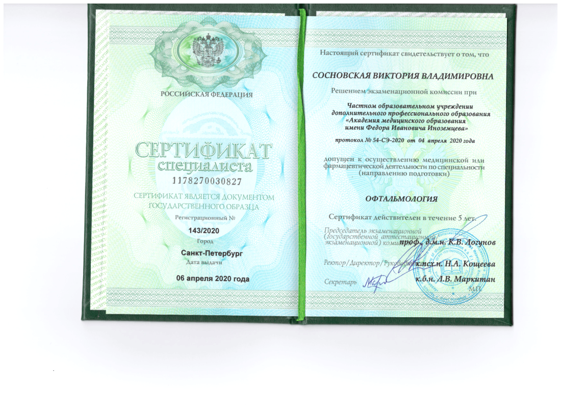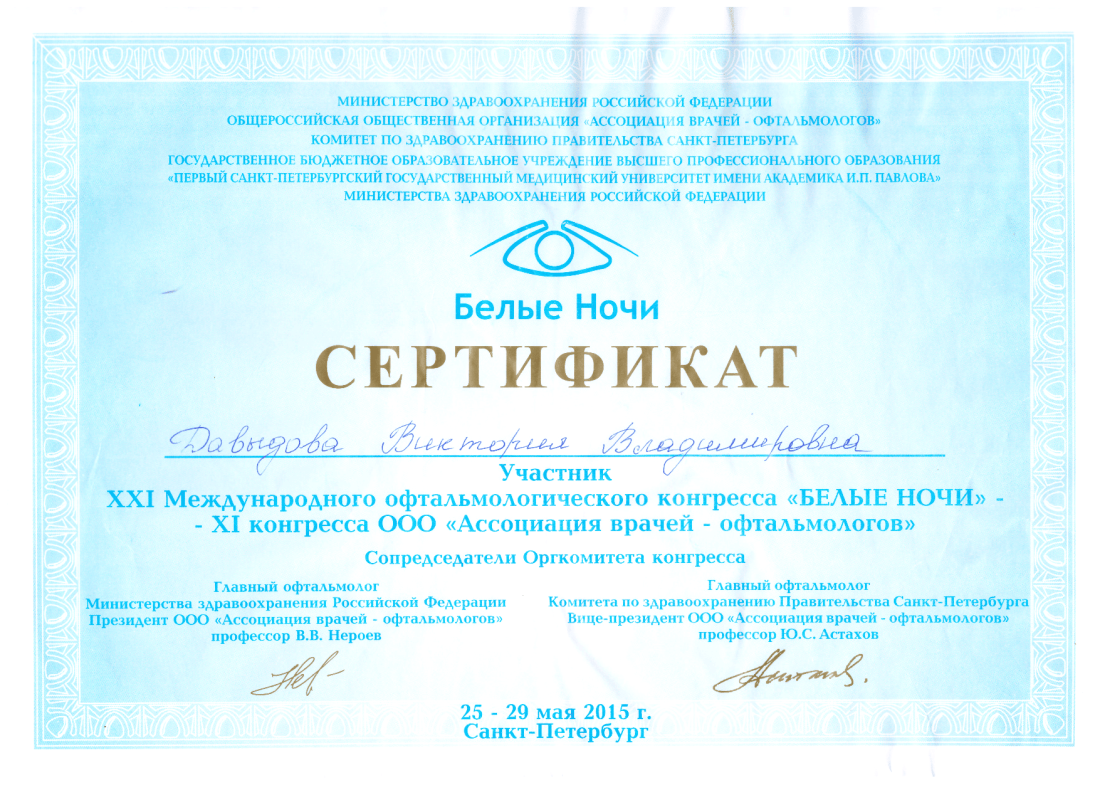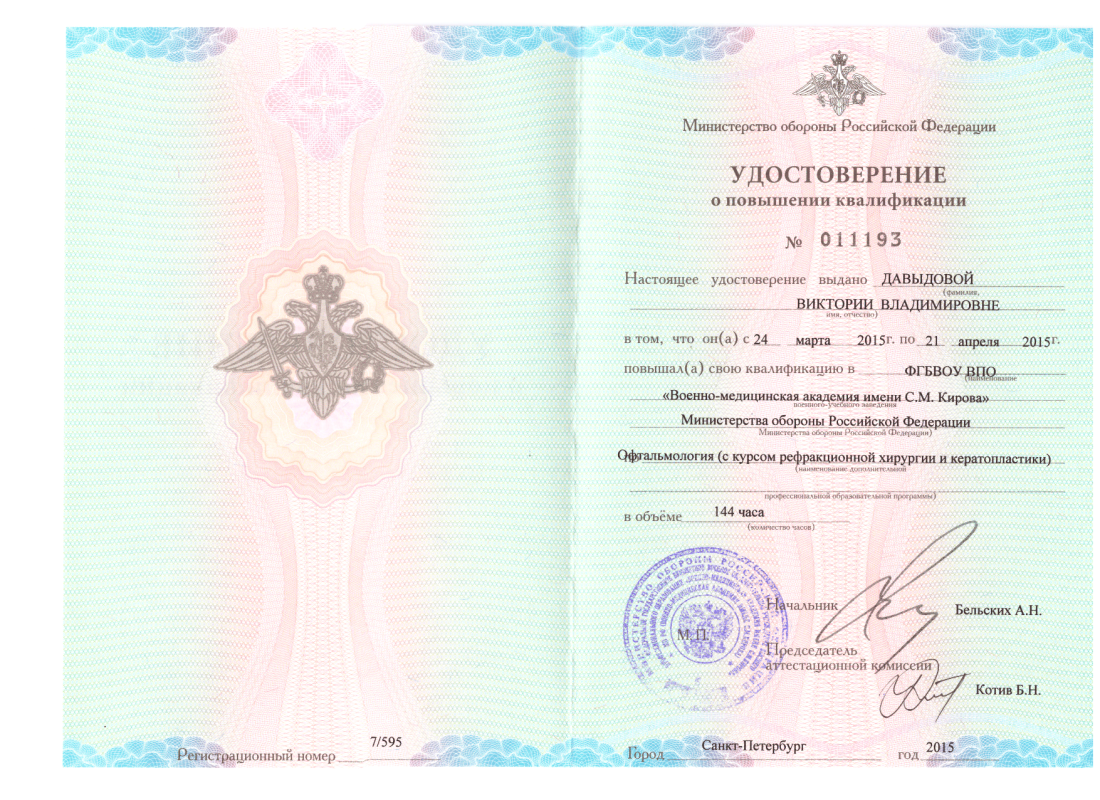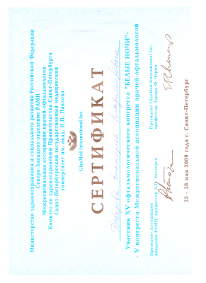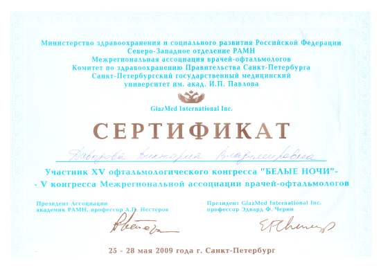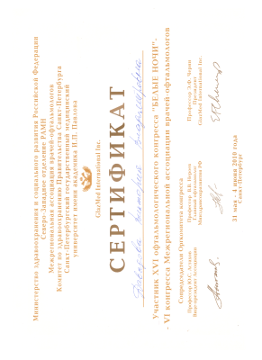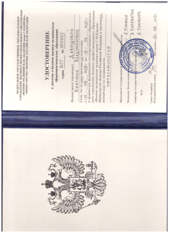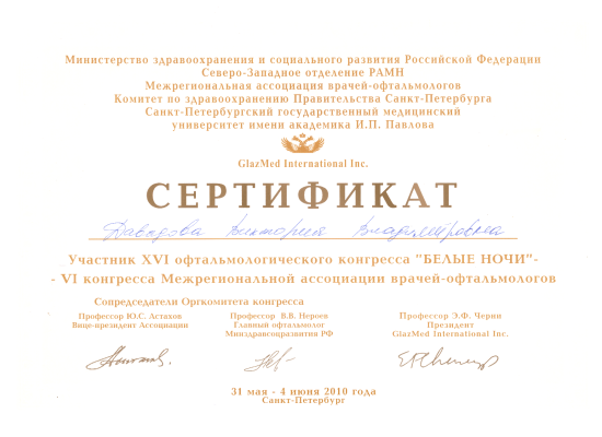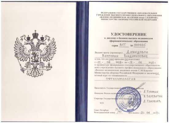 | 2008-2010 год | В МедА им. С.М. Кирова, ординатура по специальности «Офтальмология» |
