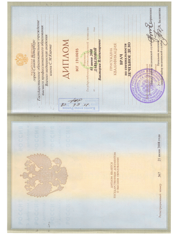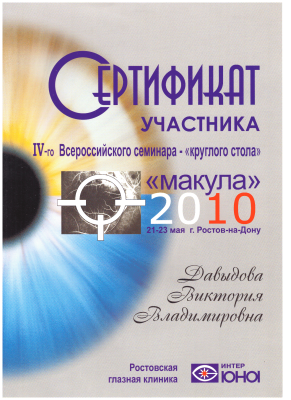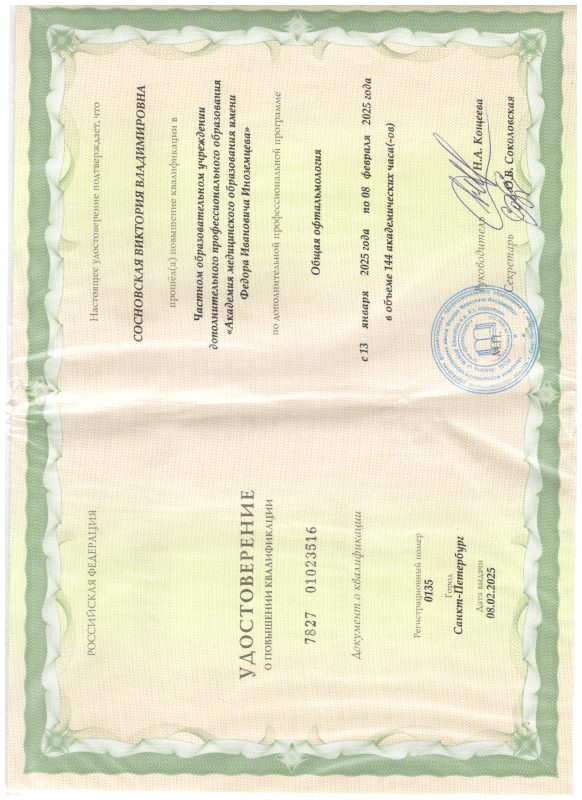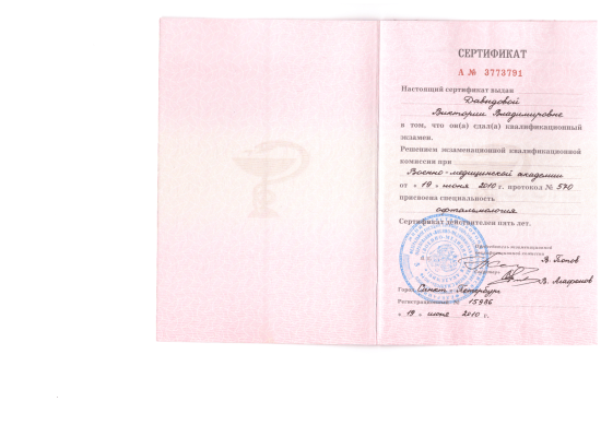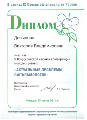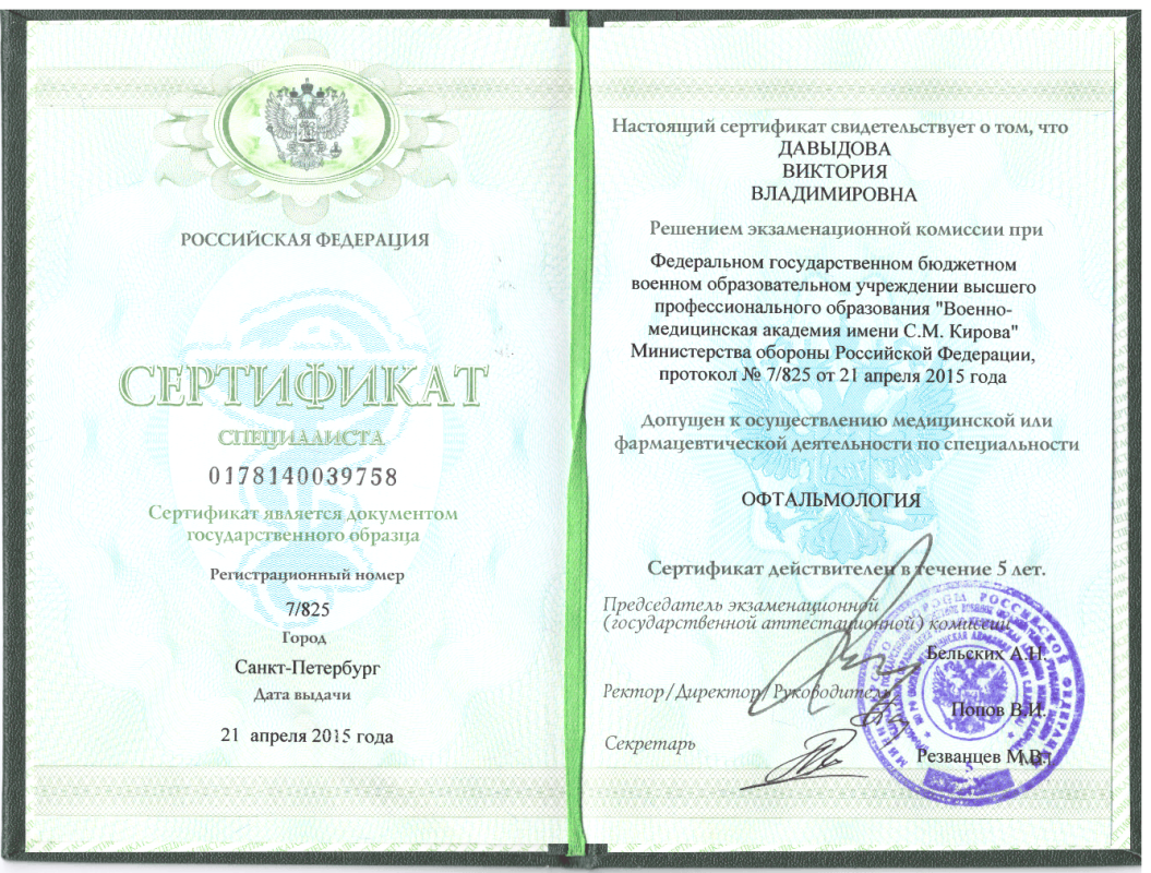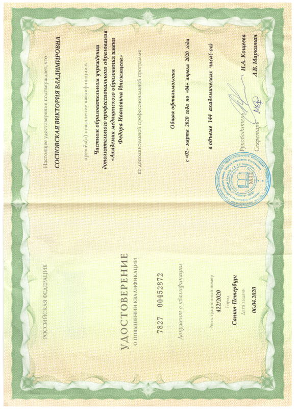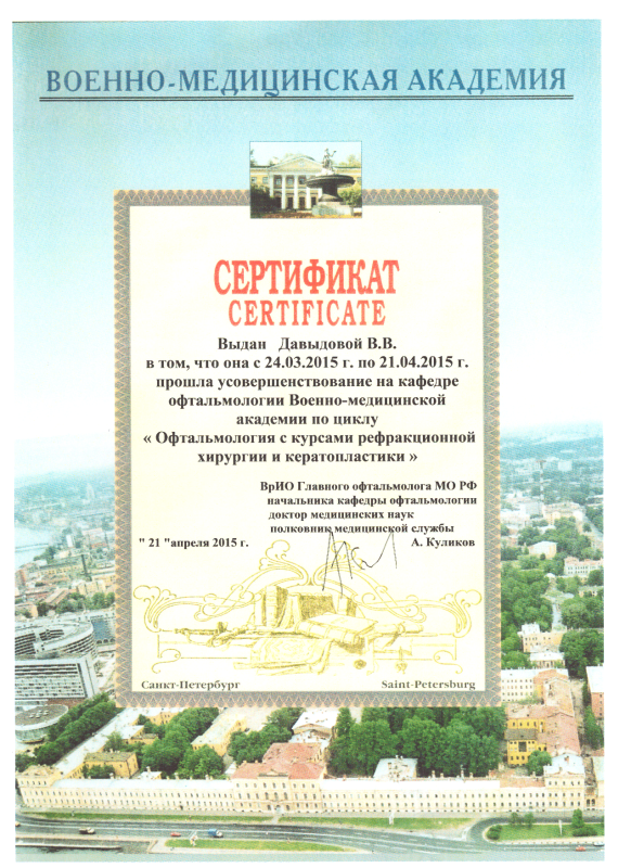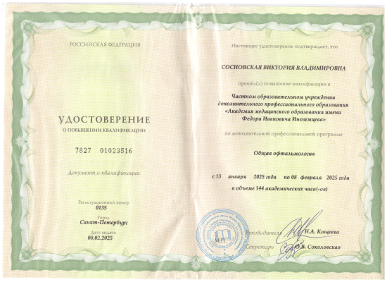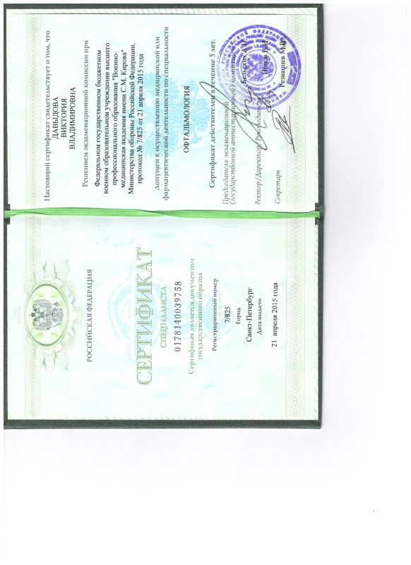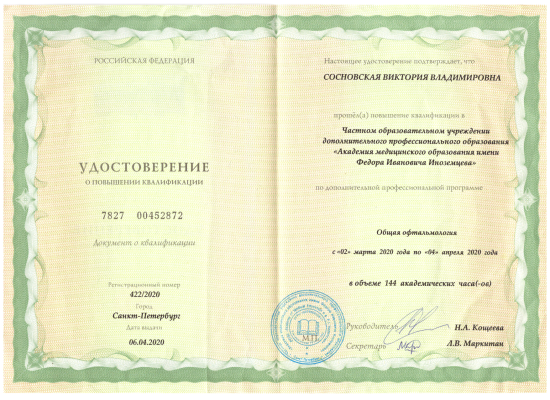 | 2008-2010 год | В МедА им. С.М. Кирова, ординатура по специальности «Офтальмология» |