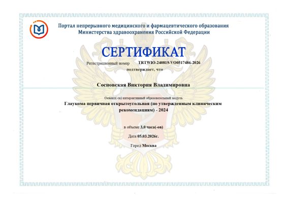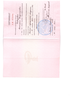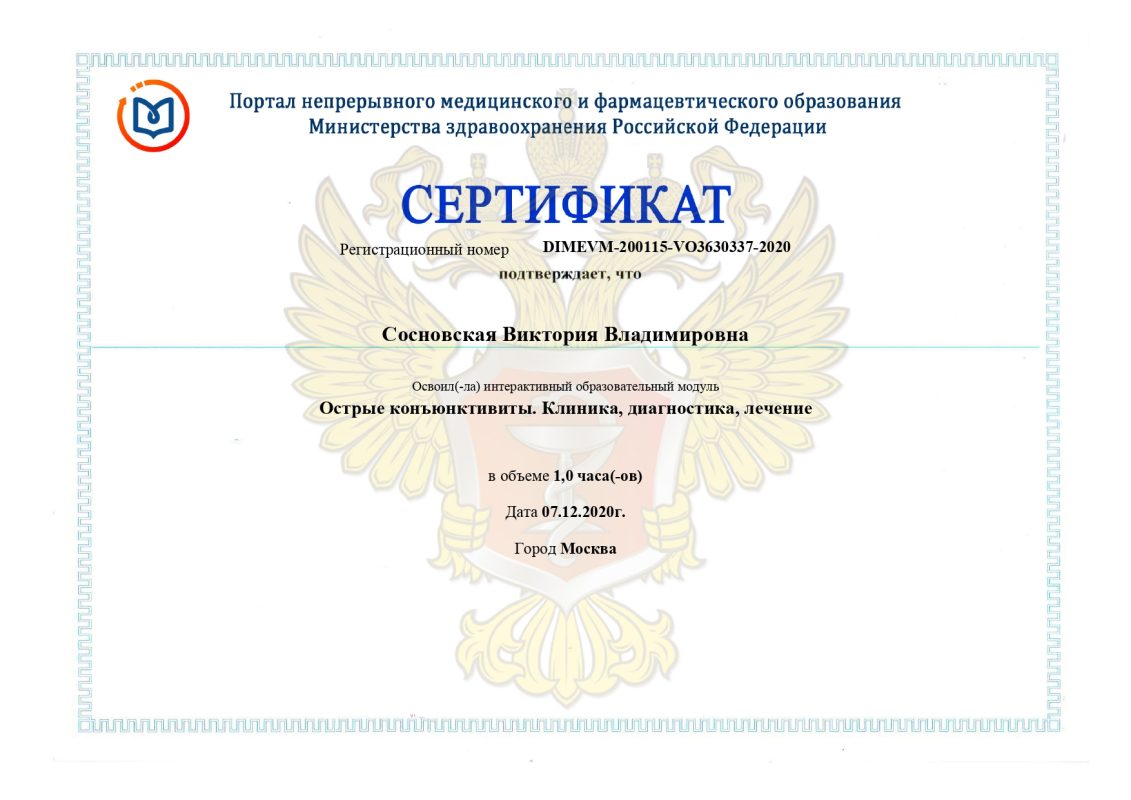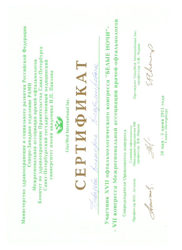 | 2011 год | СПБГМУ им. И.П.Павлова, повышение квалификации «Лазерные технологии в офтальмологии» |