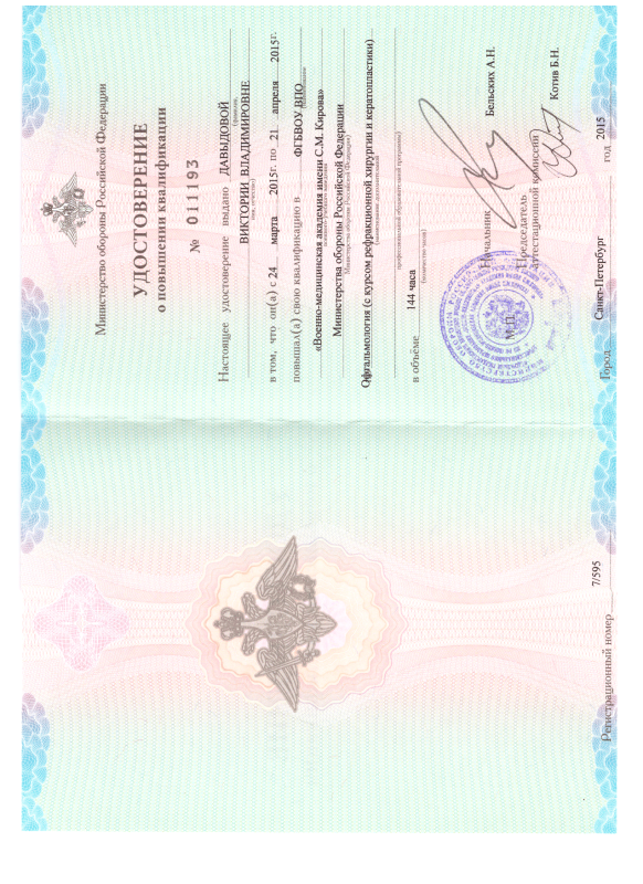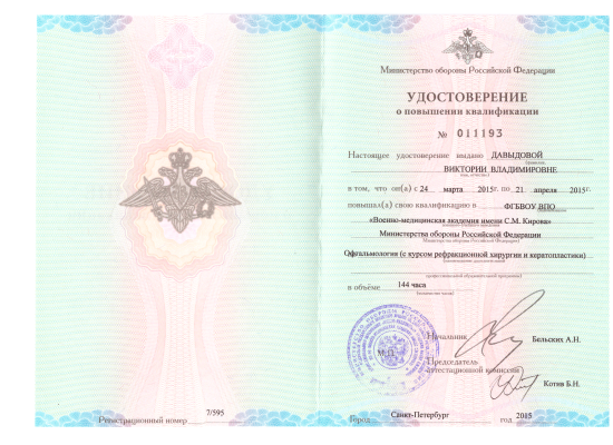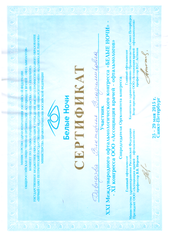 | 2015 год | В МедА им. С.М. Кирова, повышение квалификации «Офтальмология скурсом рефракционной хирургии и кератопластики» |