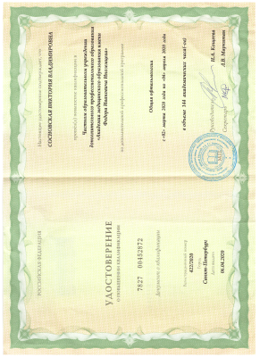 | 2020 год | ЧОУ ДПО «Академия медицинского образования им. Ф.И.Иноземцева» |