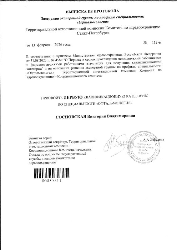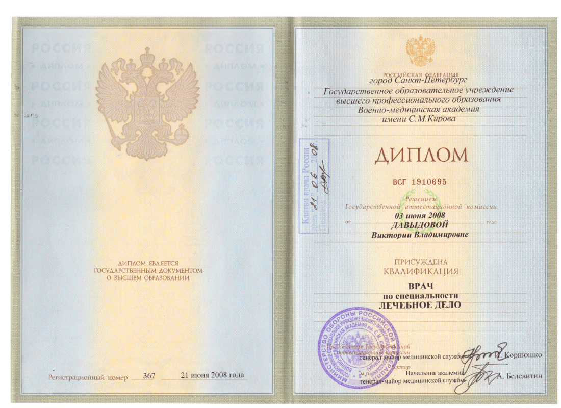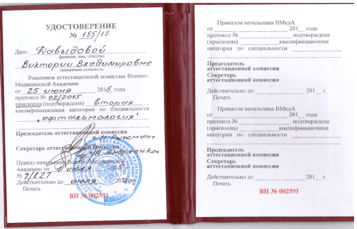 Образование: Окончила Военно-Медицинскую Академию им. С.М. Кирова в 2008 году с присуждением квалификации врач по специальности «Лечебное дело». Имеет сертификат сроком по 08.02.2030 г. по специальности «Офтальмология».