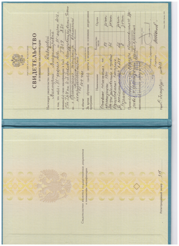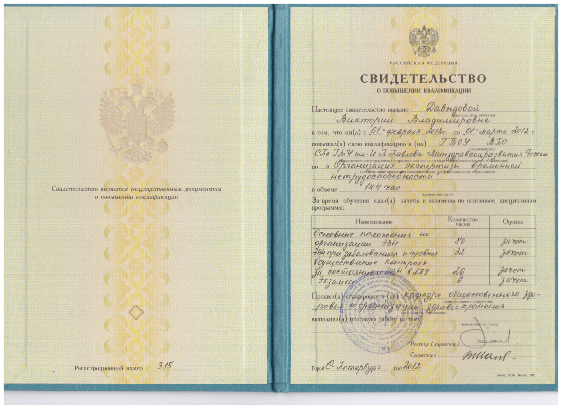 | 2012 год | СПБГМУ им. И.П.Павлова, повышение квалификации «Организация экспертизы временной нетрудоспособности» |