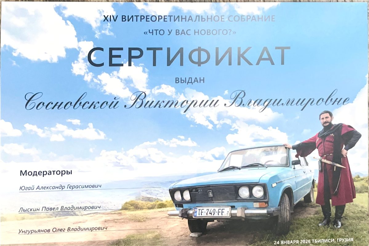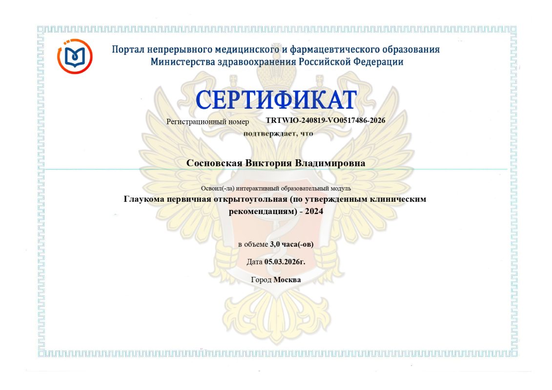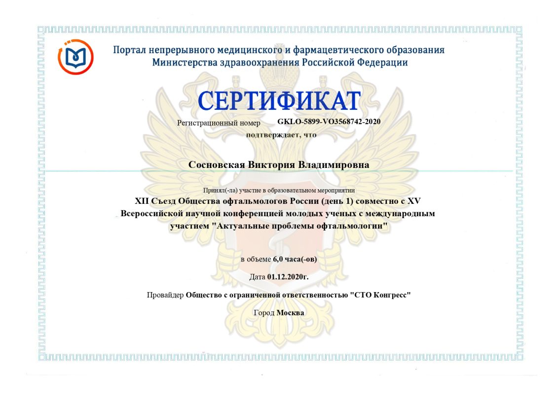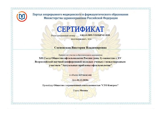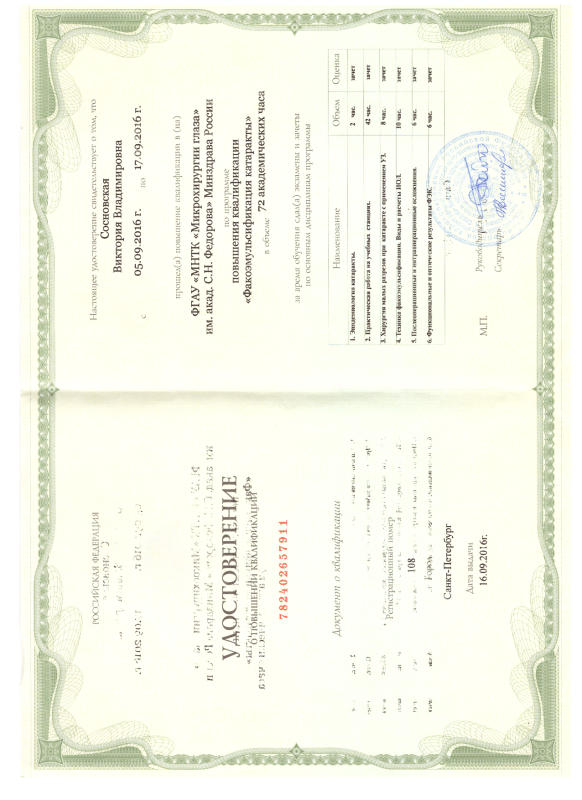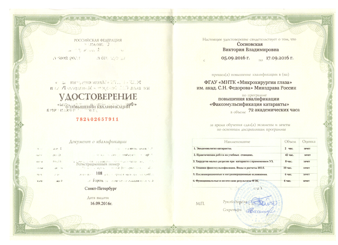 | 2016 год | МНТК «Микрохирургии глаза» им. акад. С.Н.Федорова, повышение квалификации «Факоэмульсификация катаракты» |