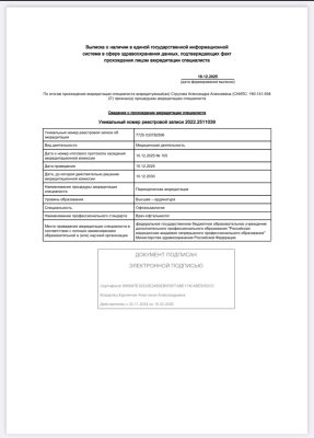 Имеет сертификат сроком по 10.12.2030 г. по специальности «Офтальмология».