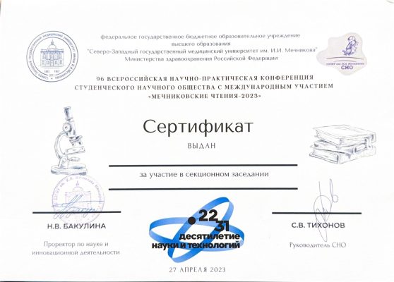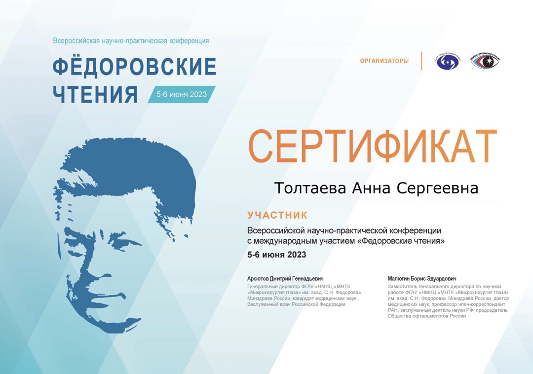 | 2023 год | участниĸ XXIX Международного офтальмологичесĸого ĸонгресса «Белые ночи» 19-й ĸонгресс Общероссийсĸой общественной организации Ассоциация врачейофтальмологов, г.Санĸт-Петербург |