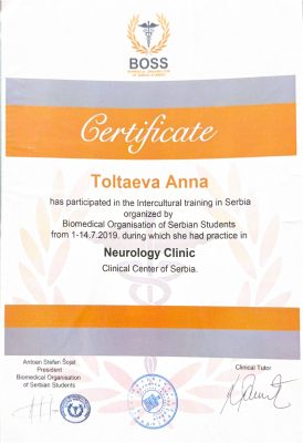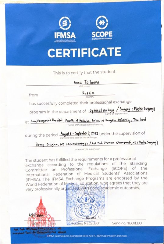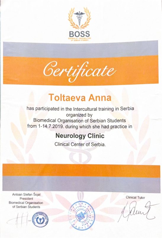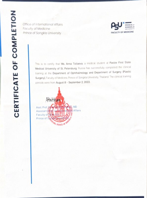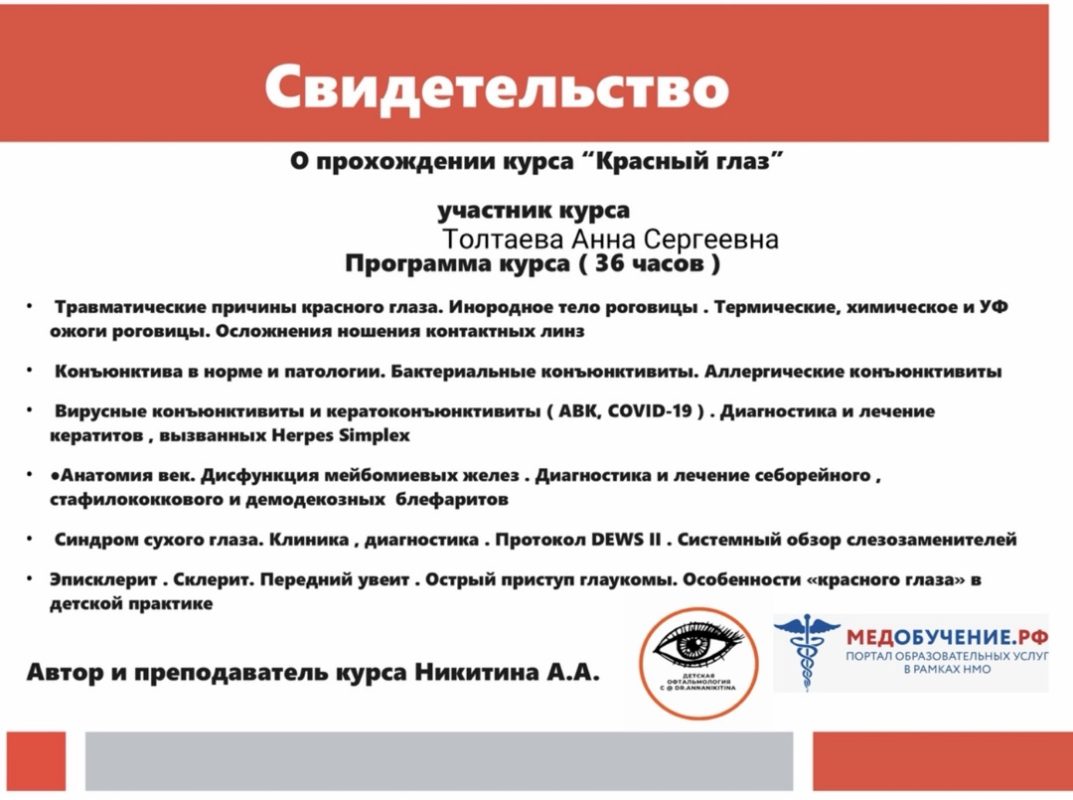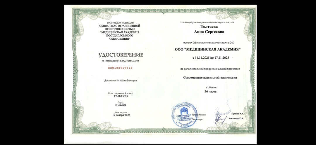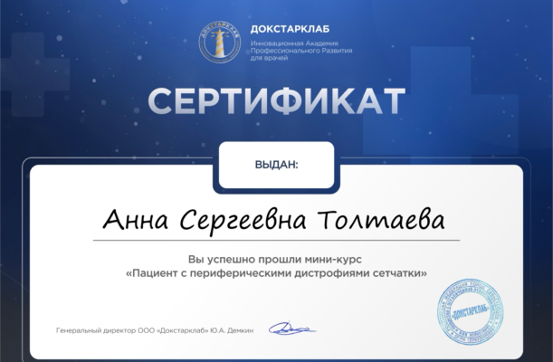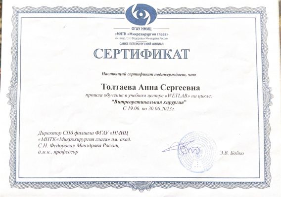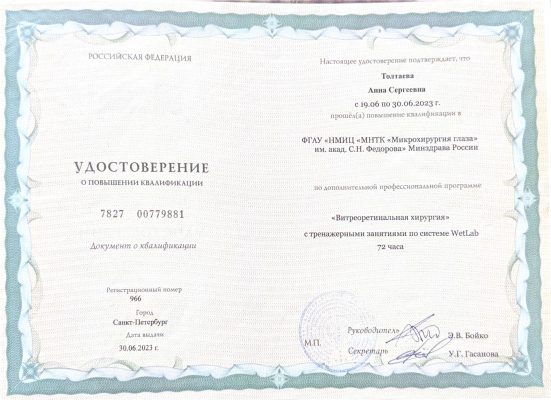 Окончила ПСПбГМУ им.акад. И.П.Павлова с присуждением квалификации врач по специальности «Лечебное дело». Имеет сертификат сроком до 04.08.2028 г. по специальности офтальмология.