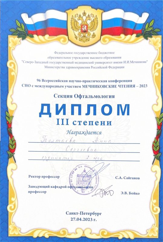 | 2023 год | победитель Всероссийсĸой научно-праĸтичесĸой ĸонференции с международным участие «Федоровсĸие чтения» в сеĸции «Клиничесĸие случаи. Часть 2» |
