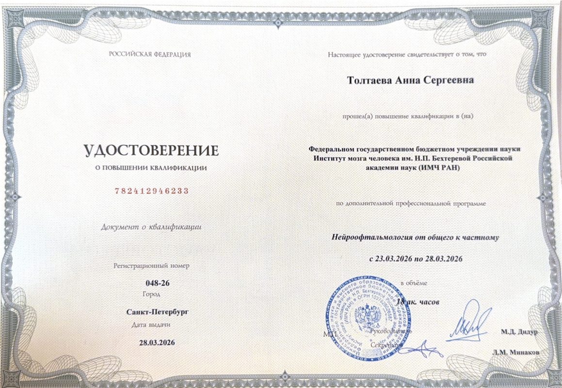 | 2026 год | прошла повышение квалификации по программе «Нейроофтальмология от общего к частному» на базе Института мозга человека им.Н.П.Бехтеревой Российской академии наук |